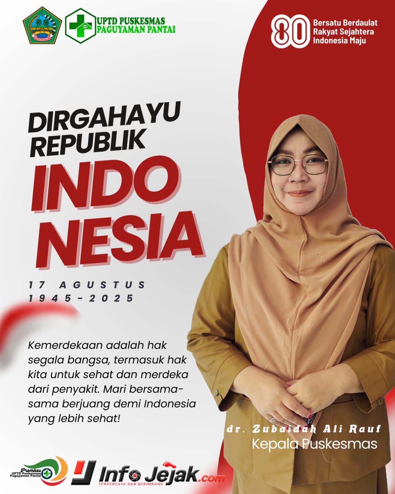 Dalam rangka memperingati Hari Ulang Tahun (HUT) Kemerdekaan Republik Indonesia ke-80 tahun 2025, Kepala UPTD Puskesmas Paguyaman Pantai, dr. Zubaidah Ali Rauf, menyampaikan ucapan selamat sekaligus mengajak masyarakat untuk menjadikan momentum kemerdekaan sebagai dorongan memperjuangkan kesehatan bersama.