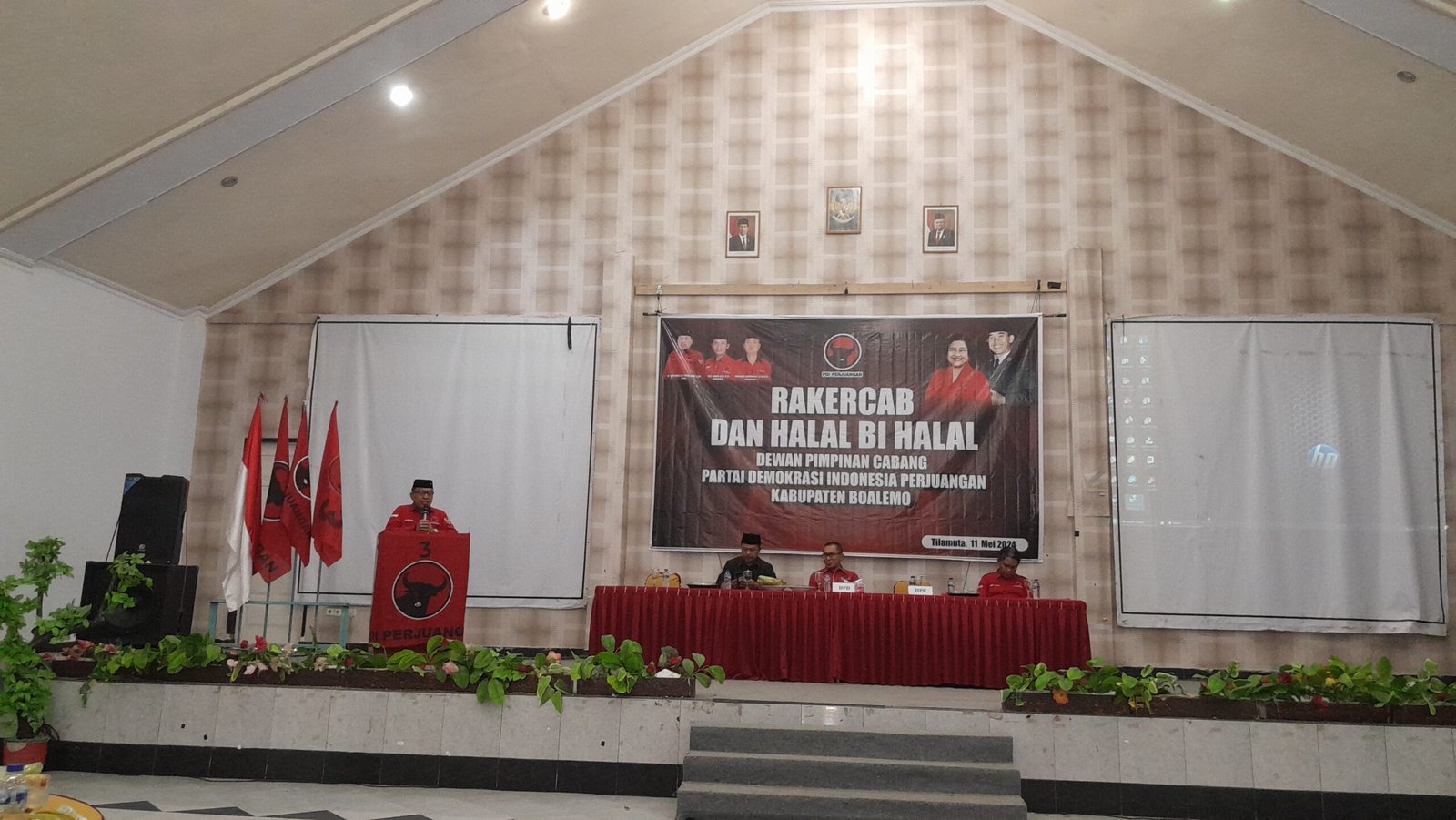 BOALEMO-Ketua Dewan Pimpinan Cabang Partai PDI Perjuangan juga sebagai ketua Dewan Perwakilan Rakyat Daerah Kabupaten Boalemo, Karyawan Eka Putra Noho menyampaikan sambutan pada kegiatan Rapat Kerja Cabang PDIP yang di rangkaikan Halal Bi Halal,bertempat di gedung putra tunggal,Sabtu 11/5/2024.