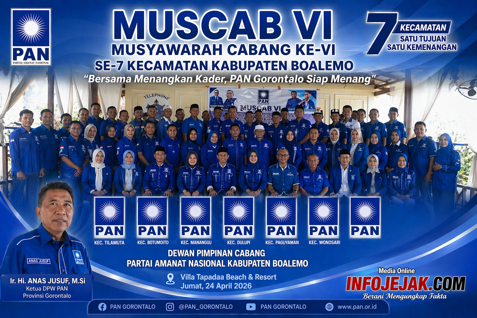 Boalemo, 24 April 2026 – Ketua DPW Partai Amanat Nasional (PAN) Provinsi Gorontalo, Ir. H. Anas Jusuf, M.Si., secara resmi membuka kegiatan Musyawarah Cabang (Muscab) ke-VI PAN se-Kabupaten Boalemo yang berlangsung di Villa Tapadaa Beach & Resort, Jumat (24/4).