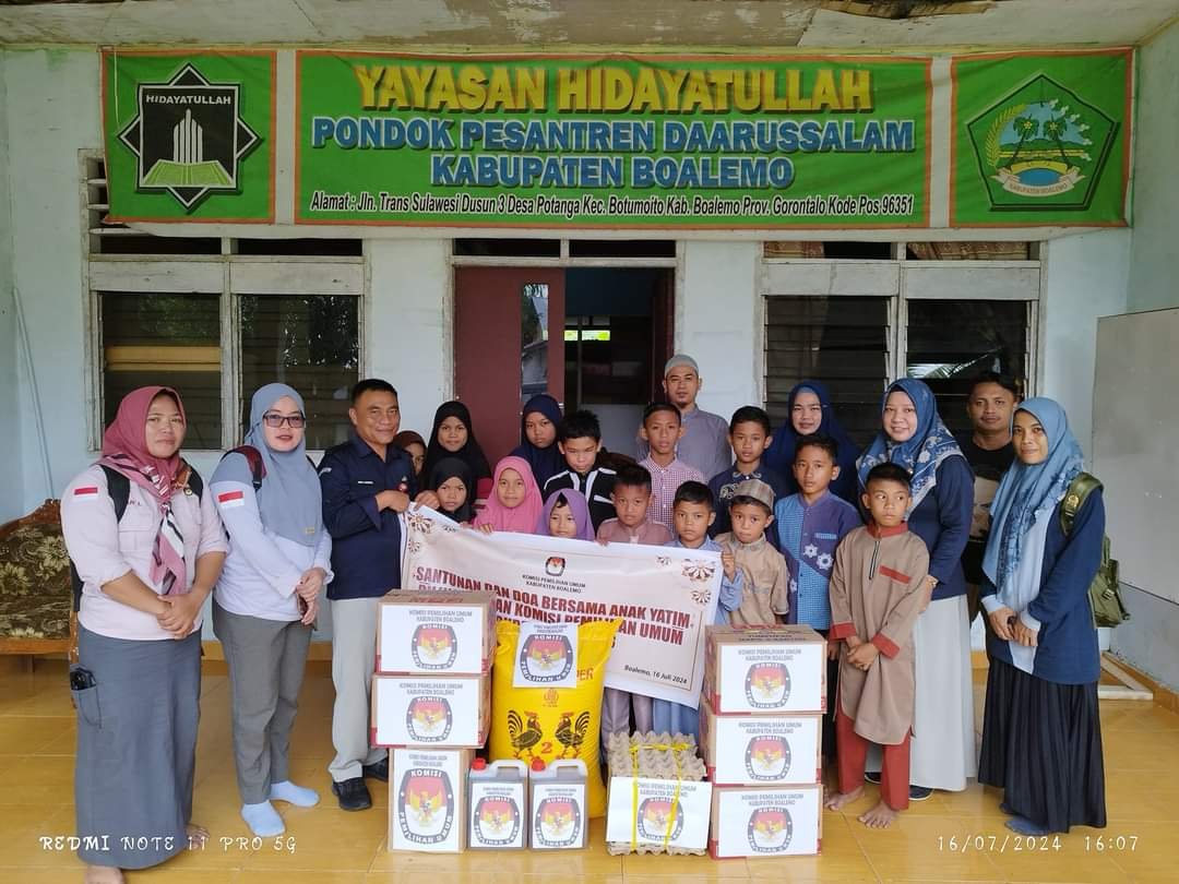 INFOJEJAK.COM-KPU BOALEMO-Komisi Pemilihan Umum (KPU) Kabupaten Boalemo melaksanakan kegiatan Santunan dan Doa Bersama Anak Yatim di Yayasan Hidayatullah Pondok Pesantren Daarusalam Kabupaten Boalemo, Bertempat di yayasan, Desa,Potanga,Selasa (16/07/24).
