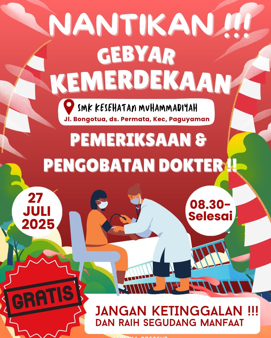 Kegiatan ini mencakup pemeriksaan dan pengobatan gratis oleh tim dokter, serta sunatan massal untuk anak-anak sebagai bagian dari program Bakti Sosial Muhammadiyah. Acara ini terbuka untuk umum dan digelar secara gratis, memberikan kesempatan luas kepada masyarakat untuk mendapatkan Paguyaman, Boalemo — Dalam rangka menyemarakkan Hari Kemerdekaan Republik Indonesia ke-80, SMK Kesehatan Muhammadiyah yang berlokasi di Desa Permata, Kecamatan Paguyaman, Kabupaten Boalemo, akan menggelar Gebyar Kemerdekaan dengan kegiatan sosial dan kesehatan bertajuk “Pemeriksaan Kesehatan, Pengobatan Gratis & Sunatan Massal”, pada Ahad, 27 Juli 2025, mulai pukul 08.30 WITA hingga selesai.